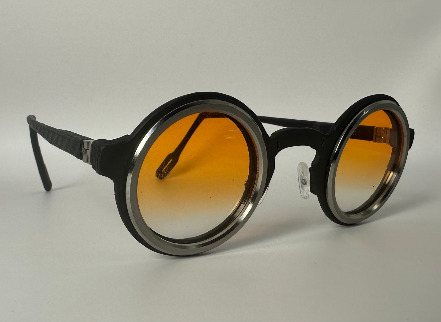 - Impressa em 3D e com acabamento manual, com a peca da orelha, em fibra de carbono - nylon.